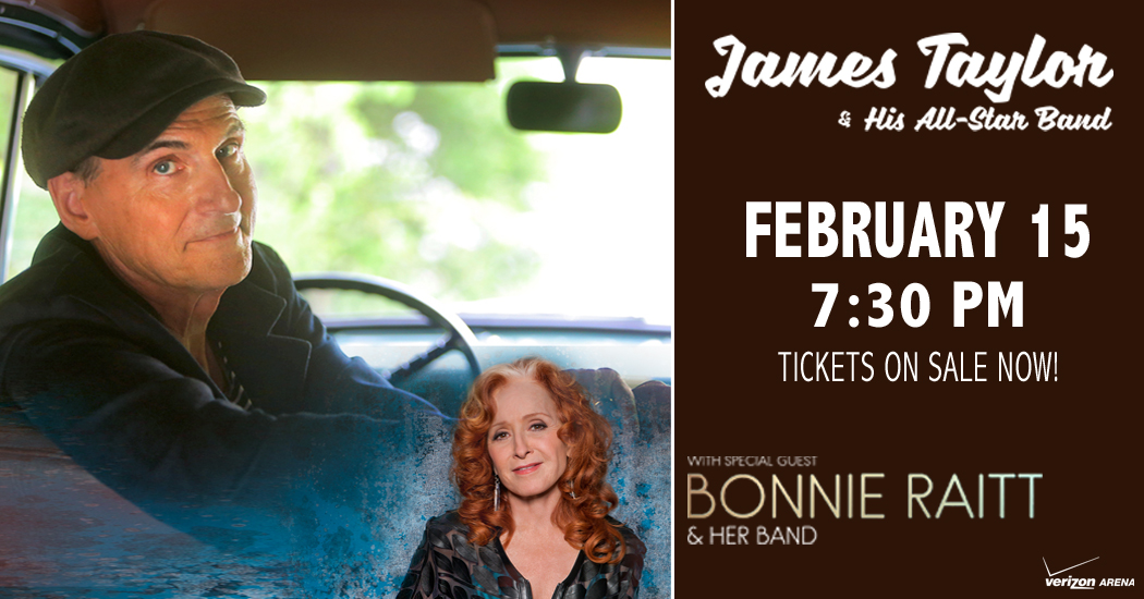 – Legendary singer/songwriter James Taylor and his All-Star Band with special guest Rock and Roll Hall of Famer Bonnie Raitt and her band are coming to VERIZON ARENA on FRIDAY, FEBRUARY 15, 2019 for one intimate and memorable night! Tickets on sale Friday, October 12 at 10 am at Ticketmaster.com .